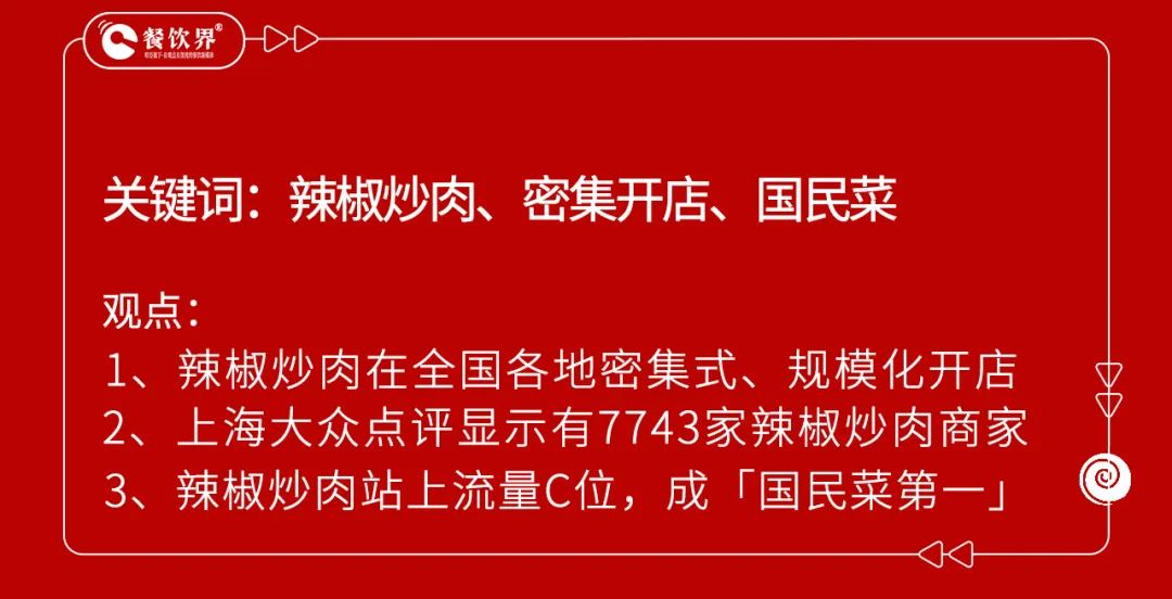 自然,我们也可以把辣椒炒肉热潮看作是菜系餐饮多元化发展的一个缩影,是菜系餐饮品牌化发展的一个方向。辣椒炒肉,为菜系餐饮提供了更轻量化、更符合大众日常消费需求的运营样本。。