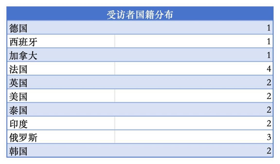 接受采访的20名外国游客分别来自德国、西班牙、法国、泰国等国家,欧美国家占70%,亚洲中国占30%。;男6人,女14人;35岁以下15人,36岁以上5人。