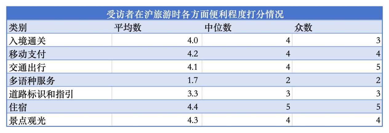 除了旅游偏好,本次问卷还对外国游客进行了入关、电子支付、住宿、景点观光等方面的便利性调查。各方面的便利性调查采用评分制,最高为5分,表示“非常方便”;最低1分,表示“很不方便”。一般来说,外国游客普遍对上海提供的入境旅游服务感到满意,70%以上的服务得分超过4分,其中住宿便利性得分最高为4.4分。然而,一些服务已经成为一个明显的缺点,多语言服务的便利性得分最低为1.7分。