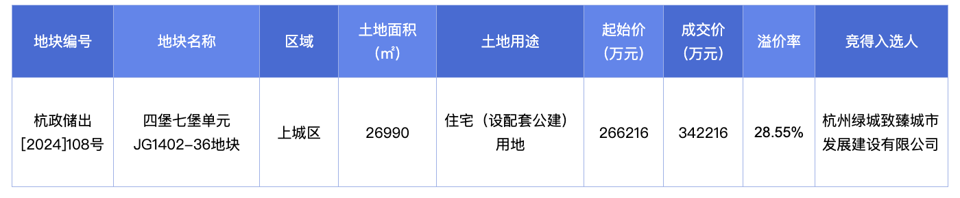 十月二十二日,杭州城区完成了2024年第十五批居住用地转让,杭政储出[2024]108号地块以34.22亿元的溢价率为28.55%,经过2个多小时、77轮竟价。