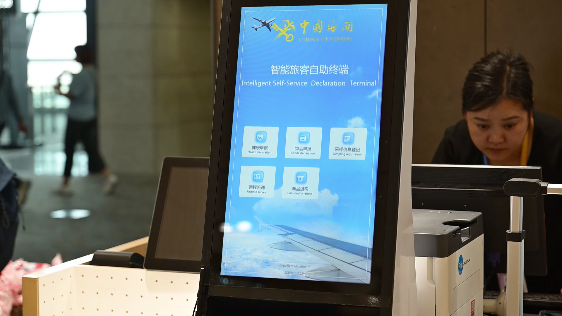 10月22日上午,一名加拿大旅客在浦东国际机场2号航站楼出境口岸隔离区退税店购买了两件工艺饰品,然后在店员的帮助下,通过“智能旅客自助终端”申请海关退税验证手续。