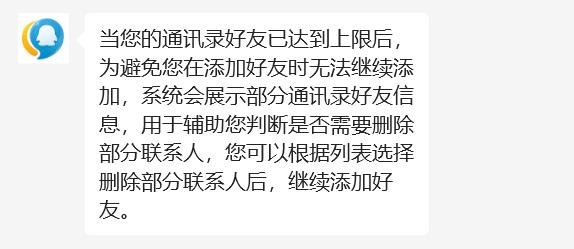 在客户通讯录好友达到上限后,为了防止用户在添加好友时不能继续添加,为了帮助确定是否需要删除部分联系人,系统会显示一些通讯录好友信息。,使用者可根据目录选择删除部分联系人,然后继续添加好友。