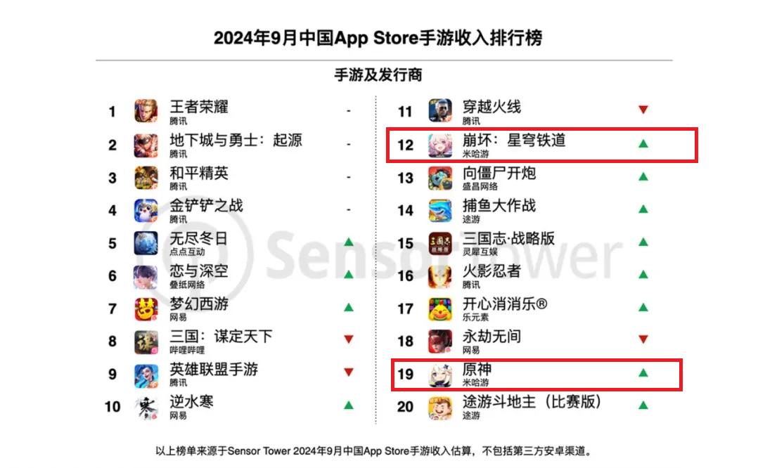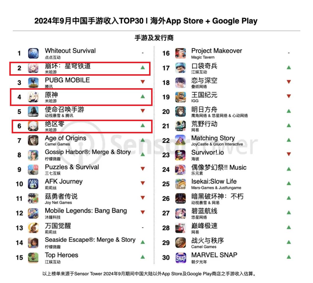 Sensor 根据Tower的数据,2024年9月中国App ToppStore手游收入 20年代中,《崩溃:星穹铁路》和《原神》分别排名第12和第19位,没有《绝区零》;2024年9月,中国手机游戏出海顶级。 《绝区零》在30中排名第六,在《崩溃:星穹铁道》和《原神》之后排名第六。