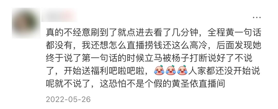 本来想和厂家唱双簧,结果成了杨子一个人的表演。厂家想说几句话,直接被杨子打断了。作为主播,黄圣依无法插话,一张嘴就被迫闭麦。当时在没有经历过最近婚姻危机洗礼的网友眼里,这些“抢风头”的场景既好玩又新鲜,他们纷纷调侃——这恐怕不是黄圣依的假直播间。