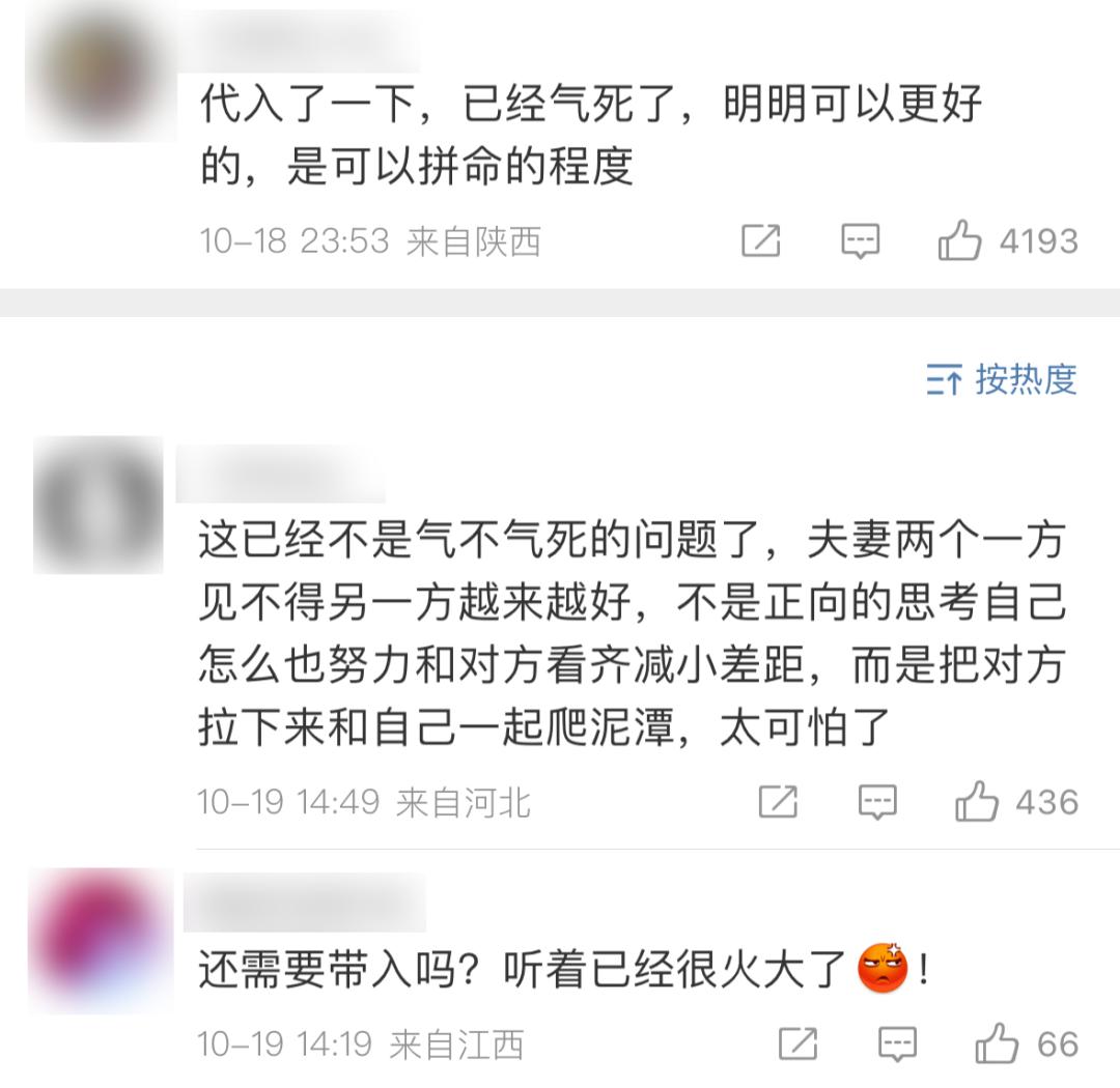 这类网民最常见的情绪是“愤怒”。她们真诚地代入了这对夫妇的相处,并且心痛黄圣依, 被杨子气死了。