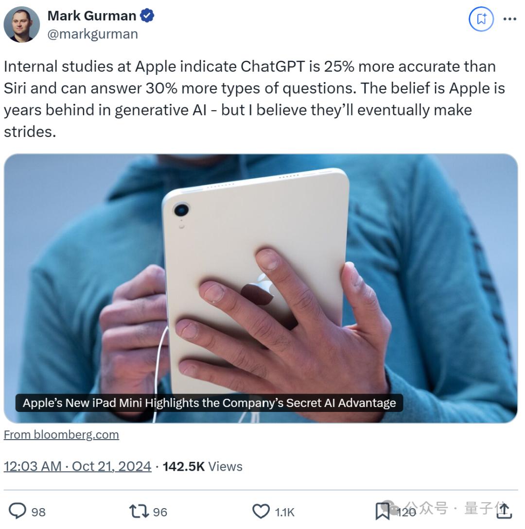 根据古尔曼爆料的苹果内部资料,与Siri相比,ChatGPT的准确率高出25%,并能回答30%以上的问题类型。