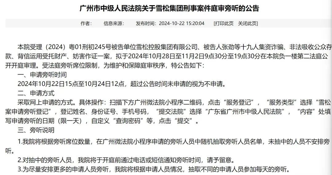十月二十二日,广州市中级人民法院发布了关于雪松集团刑事案件审查旁听的通知:本院受理(2024)粤01刑初245号被告单位雪松控股集团有限公司、被告张劲等19人集资诈骗,非法吸收公众存款,背信使用委托资产,防止作证。计划于2024年10月28日至11月2日9:30至19:30在我院负一楼第二法院公开审理。