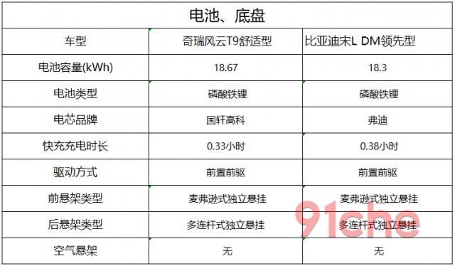 然后对比电池和底盘,风云 T9 配备国轩高科 18.67 度磷酸铁锂电池包,宋 L DM-i 搭载弗迪的 18.3 度电池,容量接近,但国轩高科的技术略逊于弗迪动力。快速充电速度,风云变幻 T9 要稍快于宋 LDM-i。在驱动形式上,两者都是前置前驱。