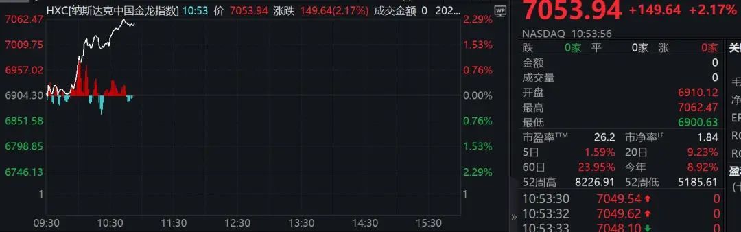 纳斯达克中国金龙指数涨幅超过2%,中概股涨幅高于2%。