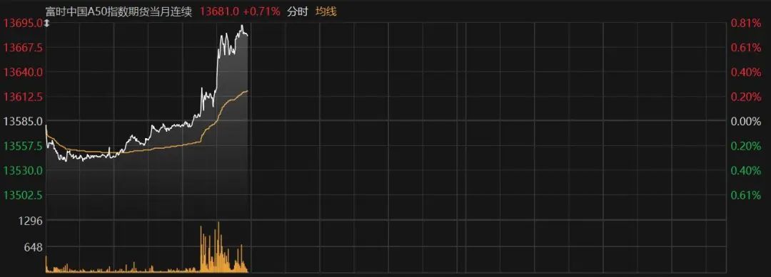 富时中国A50指数期货盘翻红,并且一度迅速上涨,截至发稿,上涨0.71%。