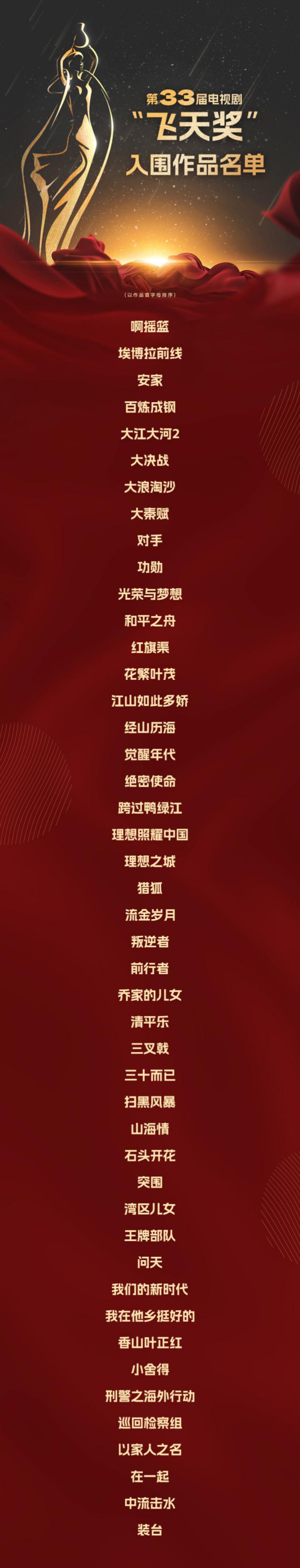 第 33 今年中国电视剧飞天奖的评选范围如下? 2020 年 1 月 1 日至 2021 年 12 月 31 当天,在CCTV或地方卫视频道播出的电视剧(包括在全国重点视频平台播出的电视剧)。