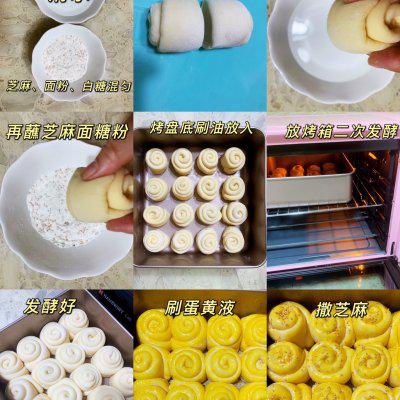 3、准备一个小碗,把少许芝麻、糖和面粉混合在碗里,然后准备一碗清水。在烤盘底部刷黄油备用。将面胚切成两半,拿起一半,先用切面沾水,再蘸芝麻面糖粉,然后放入烤盘中,切面向下。把它们都做好,放在烤箱里,第二次发酵。 1.5 倍大。发醇后,表面刷上蛋黄液,撒上芝麻。