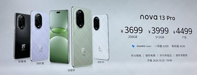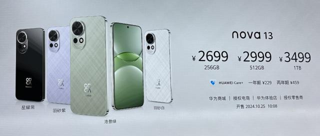 华为正式发布华为“原生鸿蒙系统之夜”暨全场景新产品发布会, nova 13 系列,其中,nova 13 256GB 版本售价 2699 元,512GB 2999 元,1TB 版本售价 3499 元;nova 13 Pro 256GB 售价 3699 元,512GB 3999 元,1TB 版本售价 4499 元,均于 10 月 25 日 10:08 发售。