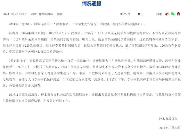 10 月 22 日,据神木新闻网报道,神木市教体局就此事发布情况报告。