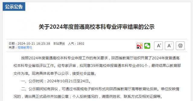 10 月 21 日,陕西省教育厅发布了《关于陕西省教育厅的公告》 2024 普通高校本科专业年度评审结果公示,拟同意 39 高校申请普通本科专业点? 91 个,最后的结果以教育部文件为准。