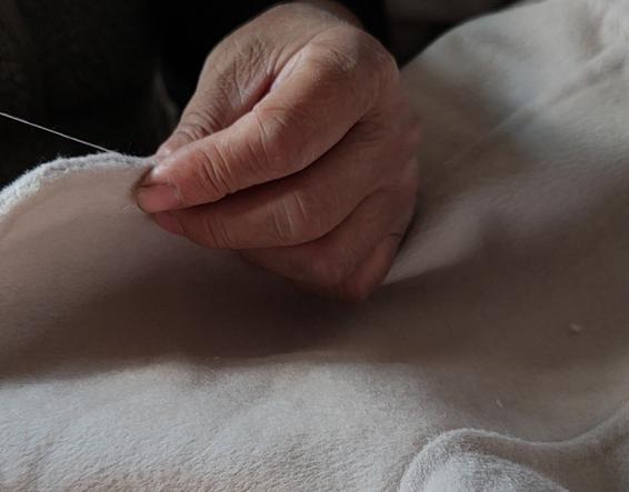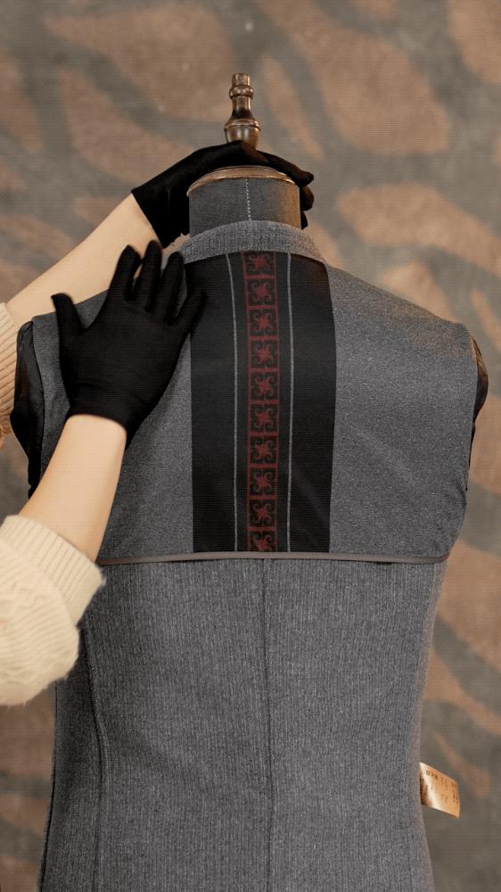 因此为保证外套的质量,需要非常讲究的使用 12 针纬平针缝合工艺,达到极高的均匀针角,将线迹隐藏起来,使接缝非常细致、密实,看不到缝合过的痕迹。