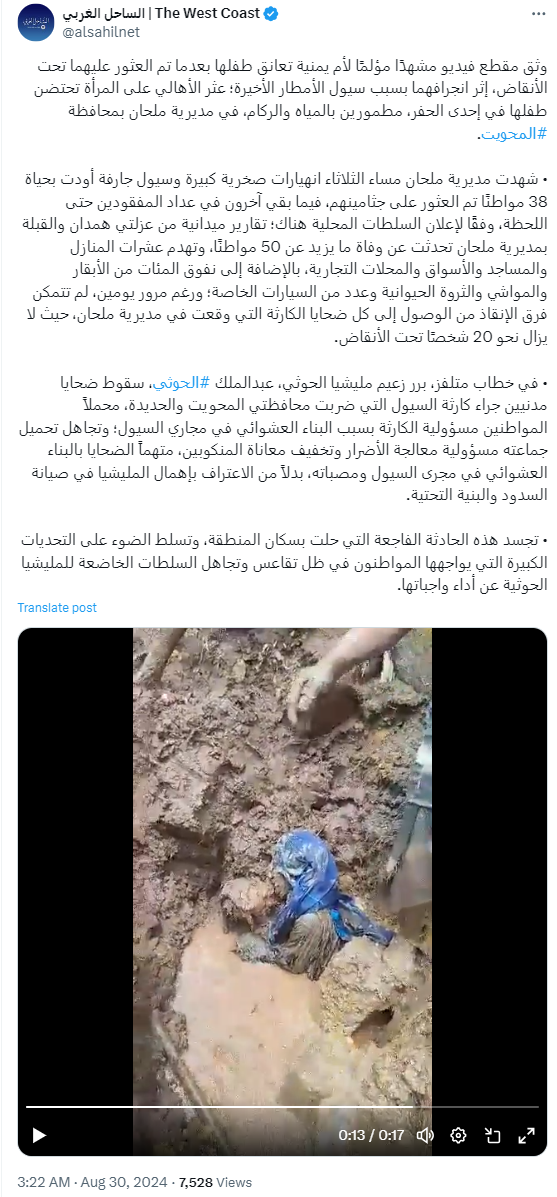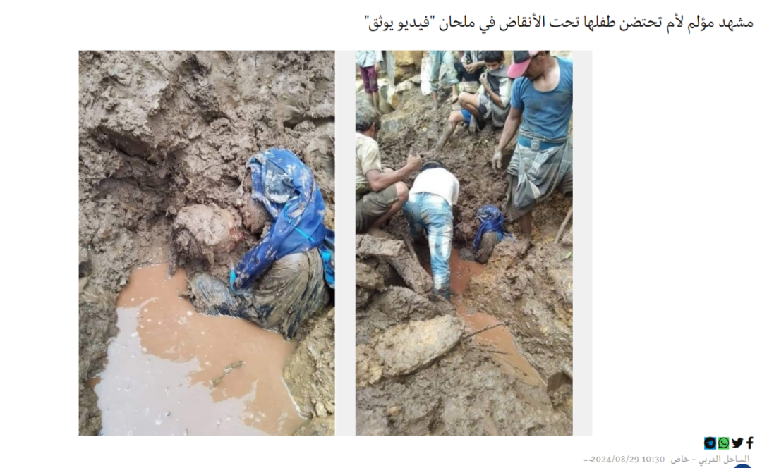 八月二十九日,Alsahil发文称,在也门北部马赫维特省马尔汉地区,居民们在一个被水和瓦砾埋藏的洞穴里发现了一名妇女和她的孩子的尸体。