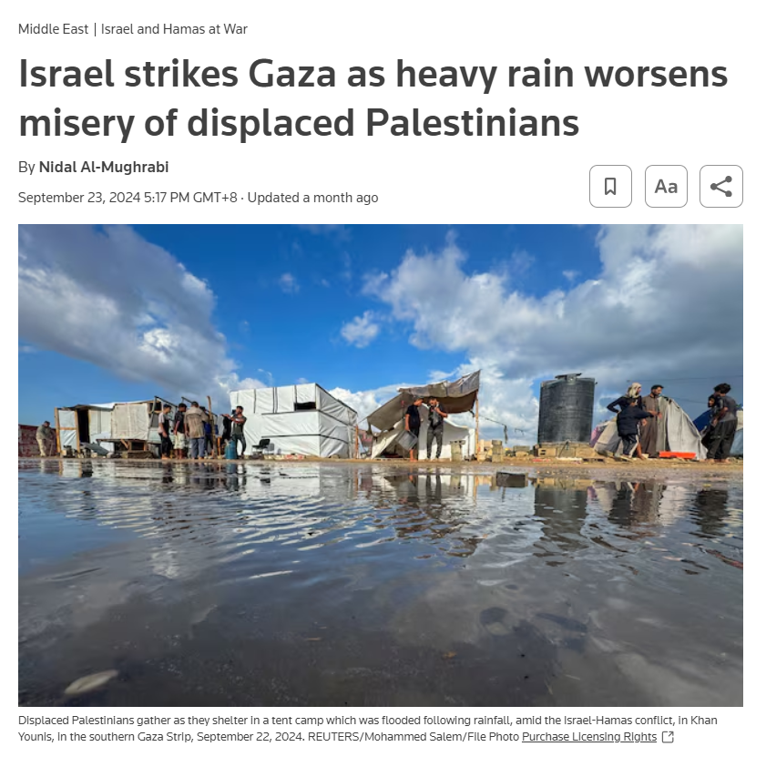 即便如此,另一方面,加沙地区的人道主义也不容乐观。九月二十三日,路透社报道称,加沙地区突如其来的暴雨,吞没并冲走了许多没有固定住所的帐篷,使一些家庭难以入睡。同一天,以色列军队在加沙地区中间进行了两次袭击,导致至少10名巴勒斯坦人死亡——以色列军队首先袭击了加沙努塞拉特一所没有固定住所的巴勒斯坦人学校,导致至少五名巴勒斯坦人死亡,然后轰炸了代尔拜莱赫市的一栋房子,导致一名妇女和四名儿童死亡。