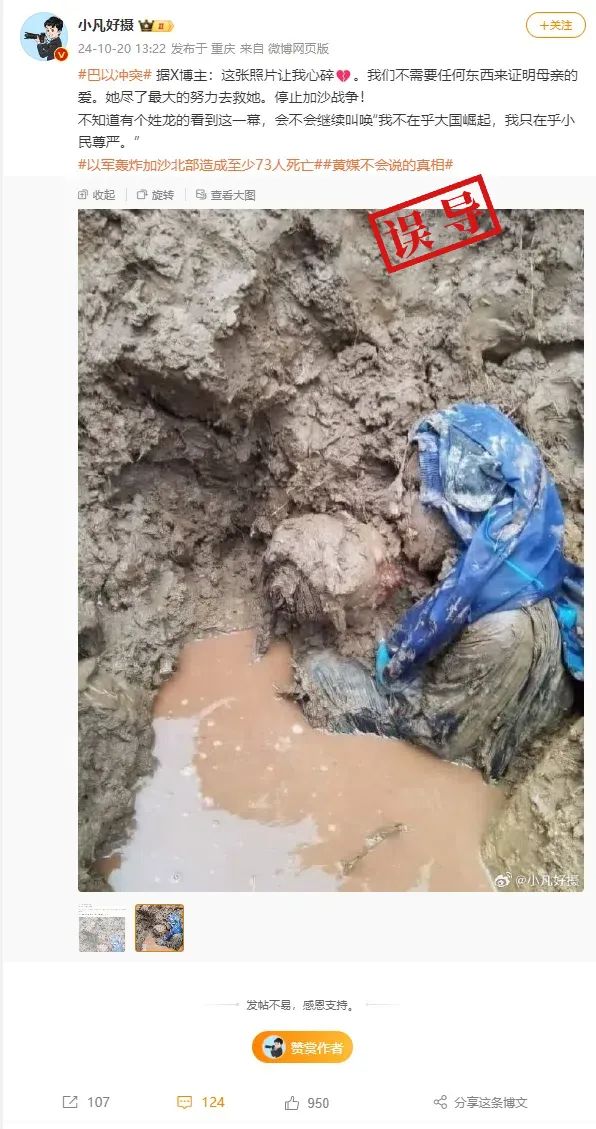 相关说法显示:“这张照片让我心碎。我们不需要任何东西来证明母亲的爱。她尽力救她。停止加沙战争!”