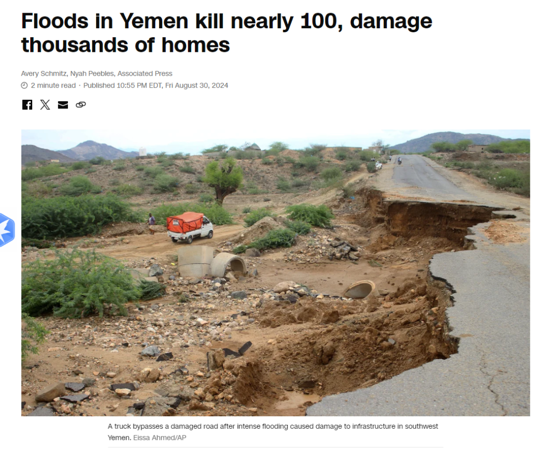 今年8月30日,美国有线电视新闻网援引联合国机构表示,8月份,严重的洪水导致也门至少97人死亡,数百万因多年战争而没有固定住所的人的粮食短缺加剧。联合国难民署表示,自7月份进入季风季节以来,该国已有3.3万多家庭受到洪水的影响。这一轮洪水造成的损失,使得450万也门人在中国没有固定住所,急需人道主义援助,情况更加糟糕。