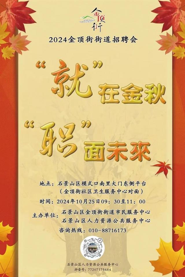 石景山金顶街街道将在 10 月 25 日早上 9 点 30 分“就”在金秋,面对未来的“职”招聘会,将会有 30 余家企业参与,为申请人提供人事主管、顾问、安全管理、清洁主管、行政、安全检查员、司机、导医等。 70 多个职位,招聘合同 700 个职位。时间:2024 年 10 月 25 星期五早晨(星期五) 9:30-11:00;位置:石景山区模式口南里小区大门东侧平台(金顶街社区卫生服务中心对面)。咨询热线:010-88716173