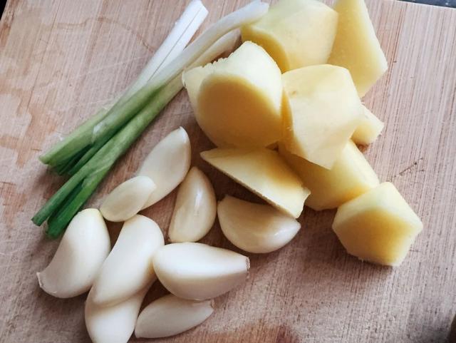 1. 将鸡肉冷水清洗干净,用厨房纸擦干水分。大蒜拍下去皮切成小块,姜切成小块,大葱切成小块。使用 1 勺沙茶酱、2 勺子酱油,小勺酱油,半碗多清水配料汁,搅拌均匀备用。
