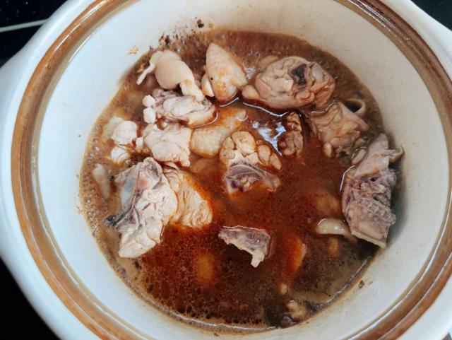 4. 炒熟后浇上调好的料汁,盖上盖子,文火炖煮。 6 分钟。