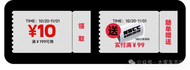 进入现场即可获得「满 199-10 券」,同时下单满 ¥ 99 元即送 NBCC 车标贴一份,限量供货,送完即止!早点下单,礼物多多!