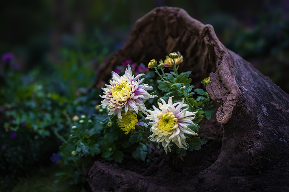 西门水杉林下散落着一些树遗骸,它们要么站立,要么躺着,要么弯曲,要么高大,与周围的菊花和其他植物形成鲜明对比。