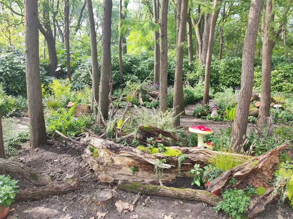 据花园介绍,工作人员精心挑选了不同形状的树干和树根。经过清洗和必要的处理,他们被安排在水杉林下的每个角落。他们不仅希望在视觉上增添一种原始而粗糙的自然美,还希望向观众传达一个信息:即使是自然灾害留下的废墟,也能在创新思维和辛勤劳动下转化为引人入胜的美景。