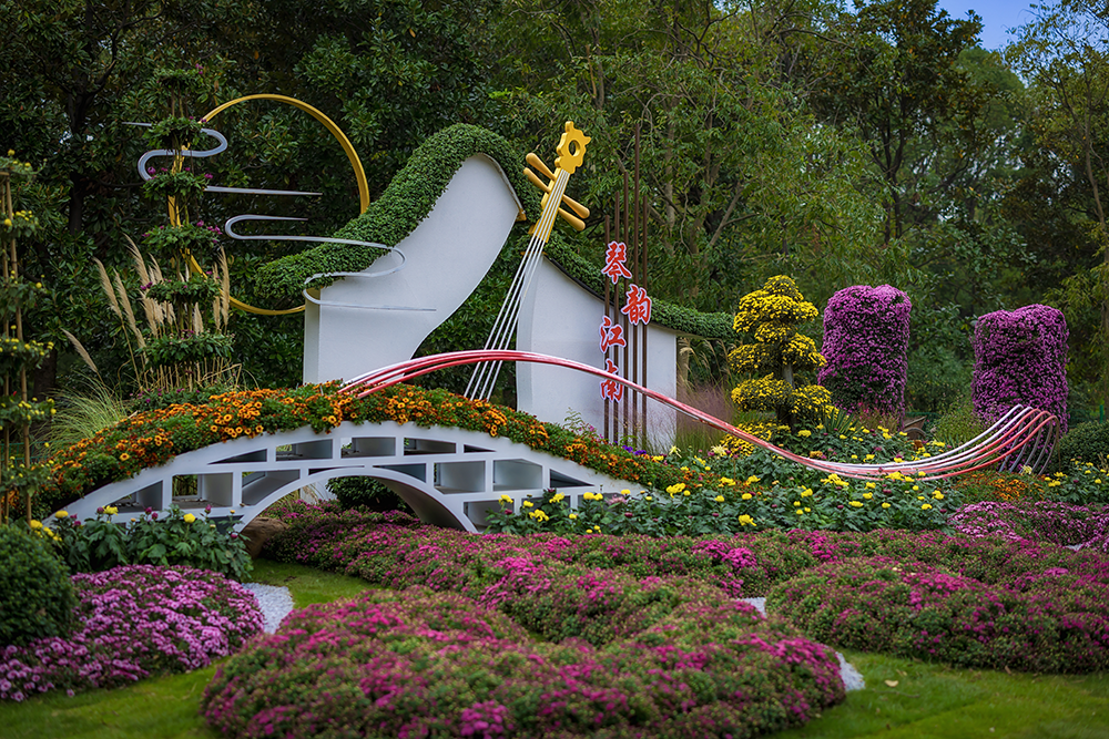 “莫奈花园”是共青森林公园河岸的一个花境。它在春天充满绿色,在夏天和秋天盛开,深受市民和游客的喜爱。菊花展期间,台风倒伏的树木和菊花也结合在一起,比如在树根的缝隙中种植菊花,或者挂在树干上,让这些花朵仿佛从树木中绽放出来。其他季节性植物和花卉也被装饰,进一步丰富了“莫奈花园”的色彩和层次感。