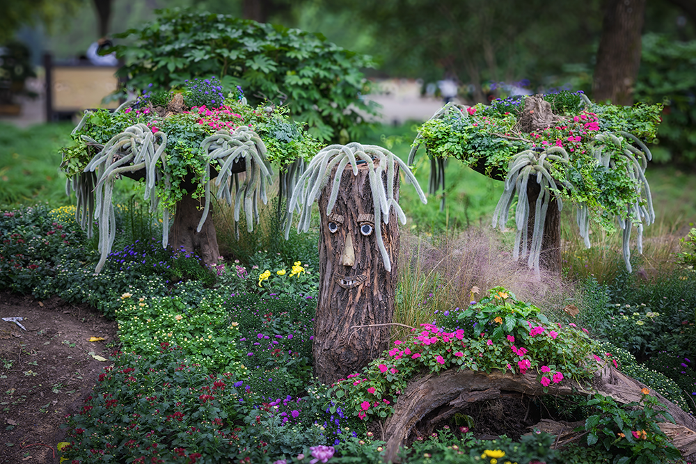 这两天,走进上海共青森林公园的游客会发现,台风中倒苗的树木,如西门入口、莫奈花园等,被做成大脸可爱的兔子、迷你火车、小凳子,点缀在花草中,一些倒苗的树干“生”出五颜六色的花朵...这些都是2024年上海菊花展精心布置的。