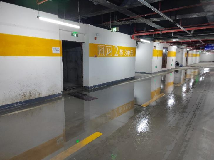 在刚刚交付的融创文化旅游城周山御园区,记者看到大门对面的主干道上有大量的水,清水从井盖上溢出。当我走进地下车库时,记者发现这里有很多水。