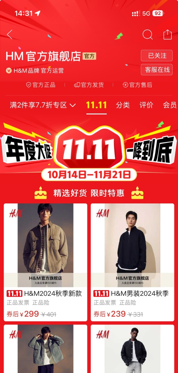 H&M拼多多官方旗舰店上线,首个双11发放超额补贴。