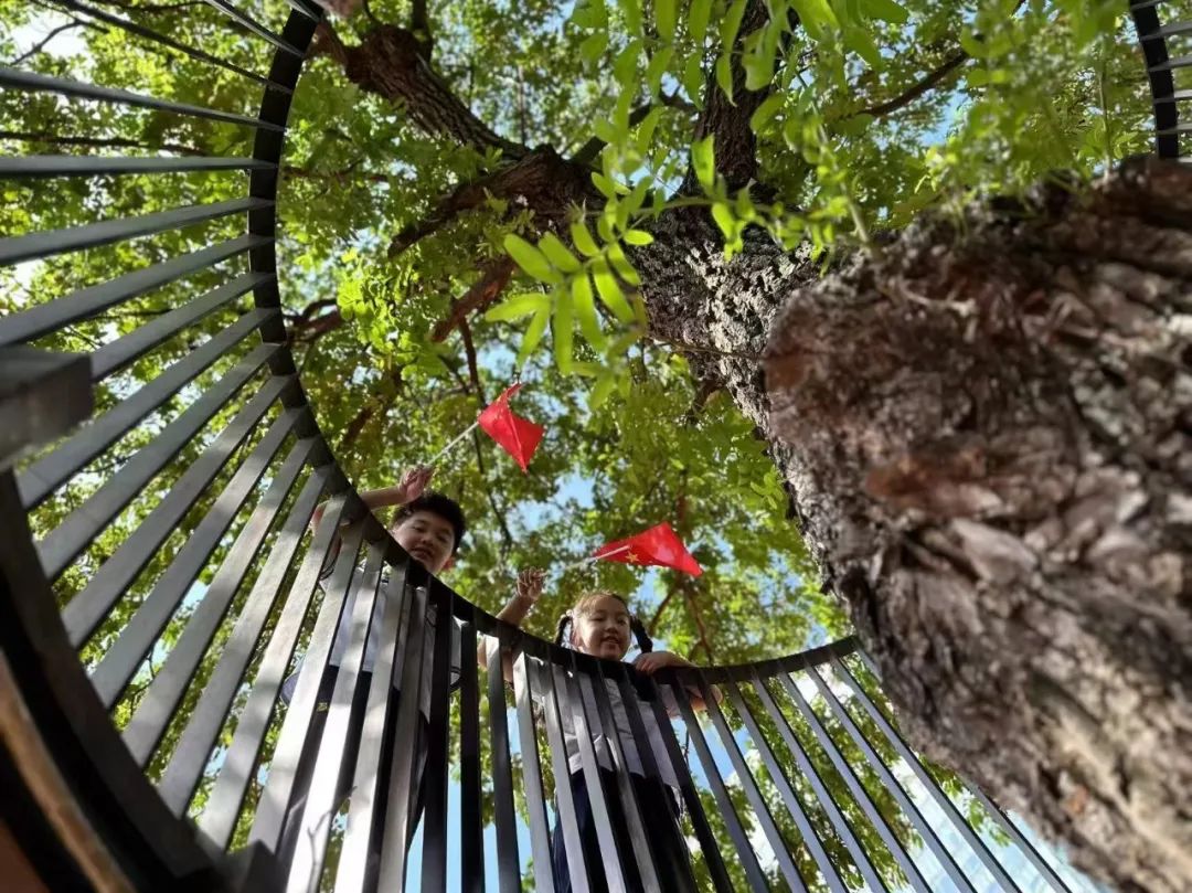 天一小学的孩子们举着国旗登上枫杨树,俯瞰着沐浴在秋色中的天一校园。