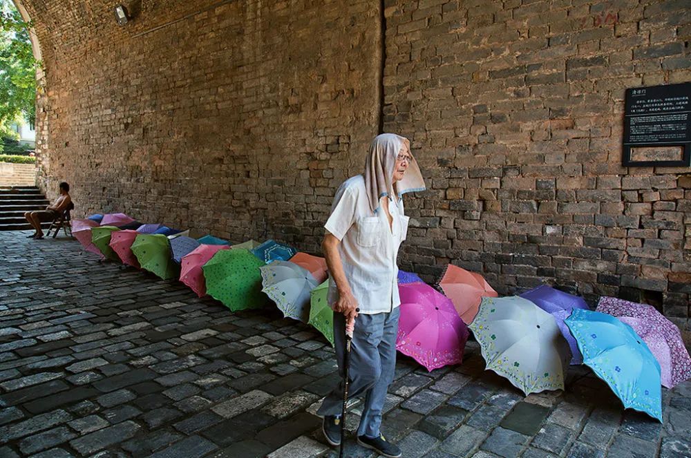 2015年7月30日,火炉南京老人头顶湿布避暑。