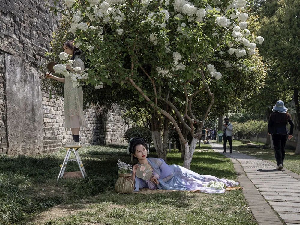 2023年4月9日,姑娘们以不同的姿势配合绣球花盛开。