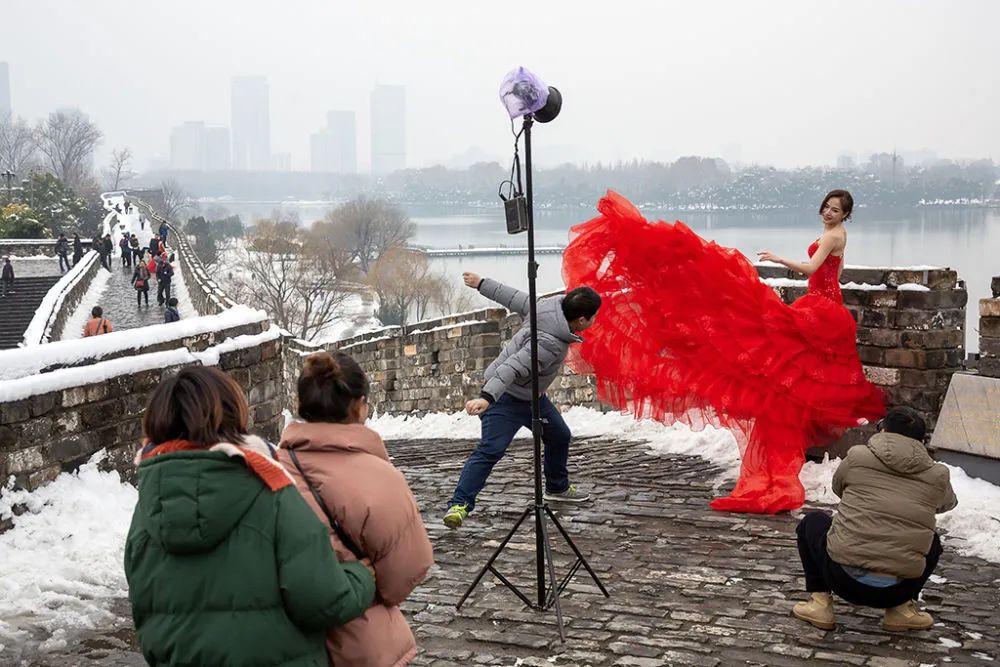 2018年1月5日,年轻人在大雪天拍婚纱照。