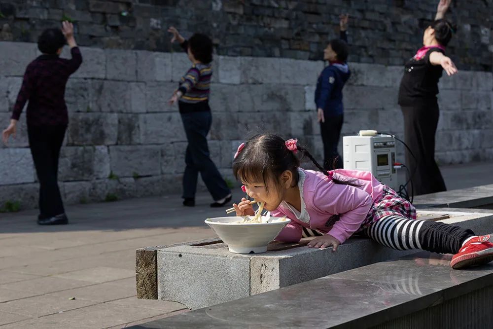 2015年10月11日,陪奶奶健身的小姑娘们以夸张的姿势吃早餐。