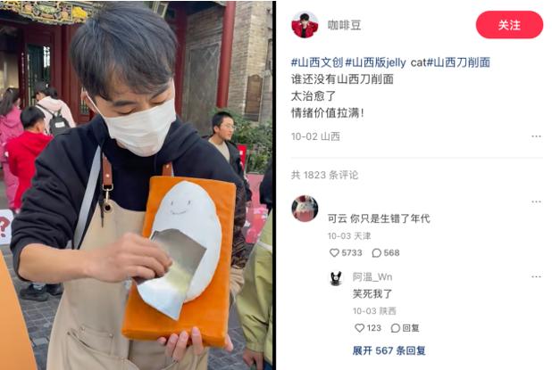 今年国庆期间,如果你去山西太原旅游,在钟楼街周围游荡时听到这样的对话,你会发现喊“刀削面”的摊主手里拿着一个柔软的毛绒玩具,而不是发酵好的面团。摊主会在顾客面前“削”毛绒面团两次,然后根据你的需求,依次选择“肉片”、“鸡蛋”、“蔬菜叶”作为配菜——当然,它们也是毛绒制品。