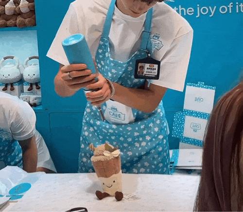 据当地媒体报道,在“Jellycat CAFÉ“店员在有限的时间内体验店铺消费后,会拿出奶油喷枪这样的工具,装在玩具上挤奶油,用包装袋包起来,然后拿给顾客,会贴心提醒他们:“尽快回去吃,奶油化了就不好吃了”。