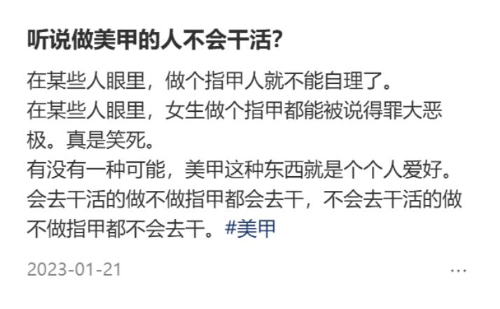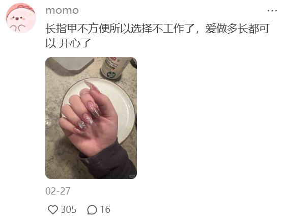 时至今日,"做了美甲就不能自理了吗"还是一个常见的话题,比如慢慢打字,洗碗,拖地,搓衣服等等。家务领域更是美甲被吐槽的重灾区。。社交媒体上有很多博主留着美甲,拍视频展示如何完成日常事务。证明美甲不是洪水猛兽——戳按钮可以用手指关节,用手掌搓衣服,剥大蒜指甲更方便。