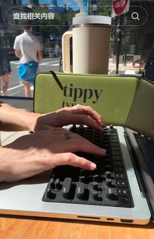 目前欧美最受欢迎的是装键盘包。“brat绿”,有点像牛油果奶昔,也有点像老青苔,总而言之,一种审美派系,一种亚文化,已经围绕这一色号发展起来。Tippy 这就是Type的原因具有成为时尚单品的潜力——走进咖啡馆,打开电脑屏幕,把Stanley杯放在桌子上,把键盘包放在水杯上,拿出键盘套贴上去,挥舞着长长的指甲,开始像飞指一样飞翔。白人美学已经是next了。 level。