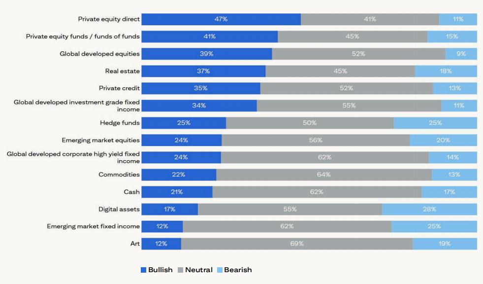 - 看涨情绪普遍存在。家庭对私募股权最乐观——无论是直接投资还是基金投资,全球发达股票的情绪明显比去年更活跃。