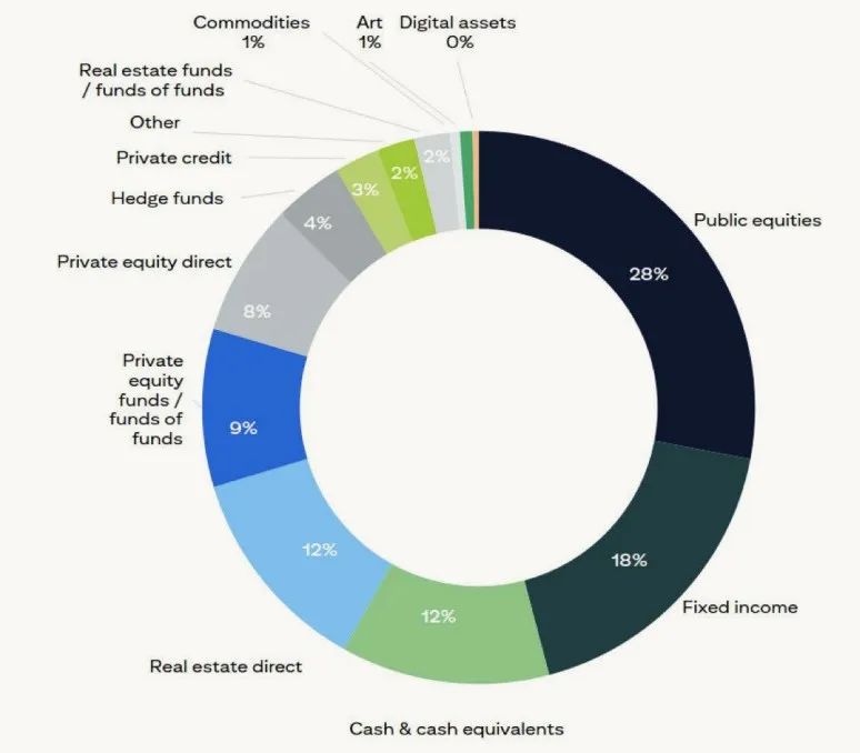 2024年,家庭最大的两大资产类别——公开股和固定收益的权重进一步增加。公开股从22%上涨到28%,固定收益从16%上涨到18%。