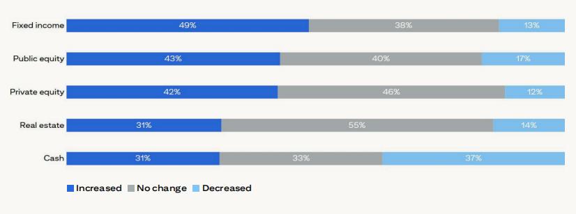 近一半的受访者(49%) 由于回报率接近多年高点,增加了固定收益配置。同时,43%的人增加了公开股市复苏的权重,而2023年的比例是20%。