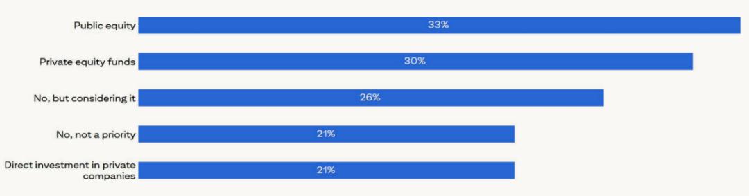 同时,他们也对私募股权表现出兴趣,42%的人增加了私募股权的配置,而去年38%的人增加了配置。