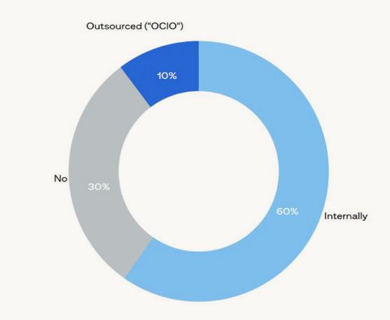 就全球性而言,大多数家办(60%) 表示他们拥有内部首席投资官 (CIO),而且近三分之一的家办没有内部首席投资官,10%的家办表示依赖外包CIO解决方案。