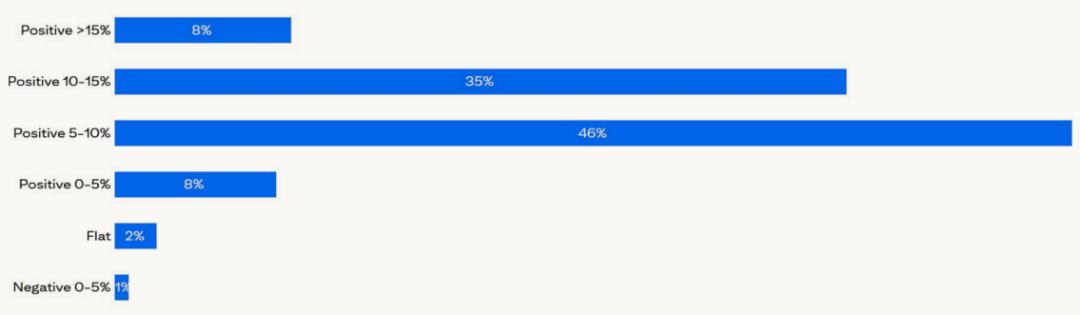 对未来12个月资产配置预期收益,受访者几乎一致 (97%) 预计未来12个月资产配置将获得正回报。大约一半的受访者预期收入在5%-10%之间,而另外三分之一的受访者预期收入在10%-15%之间。