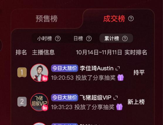 以飞猪为例。它与万豪、雅高、希尔顿、迪士尼、环球影城等议价权最强的商家有着强烈的绑定关系。淘宝领域的分发效果显著。10月21日,飞猪官方直播间淘宝直播排名仅次于李佳琦。